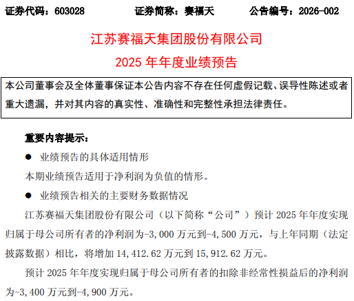 值得注意的是,临时停产公告发布当日,赛福天发布了2025年业绩预告。该公司去年(2025年)净利润约亏损3000-4500万元,同比减亏;扣非净利润亏损3400-4900万元。