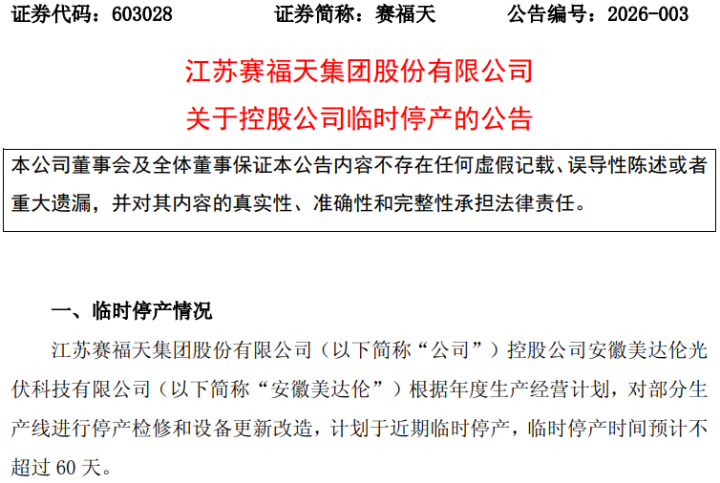 公告显示,停产期间,除生产环节外,赛福天市场拓展、客户对接、供应链管理等其余经营活动均保持正常开展。